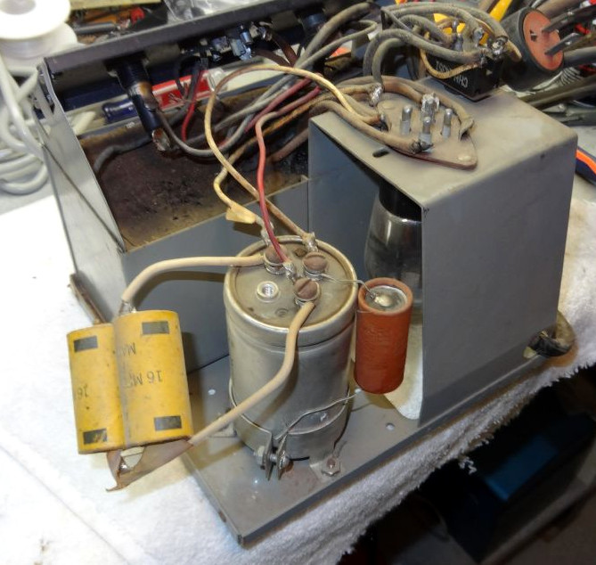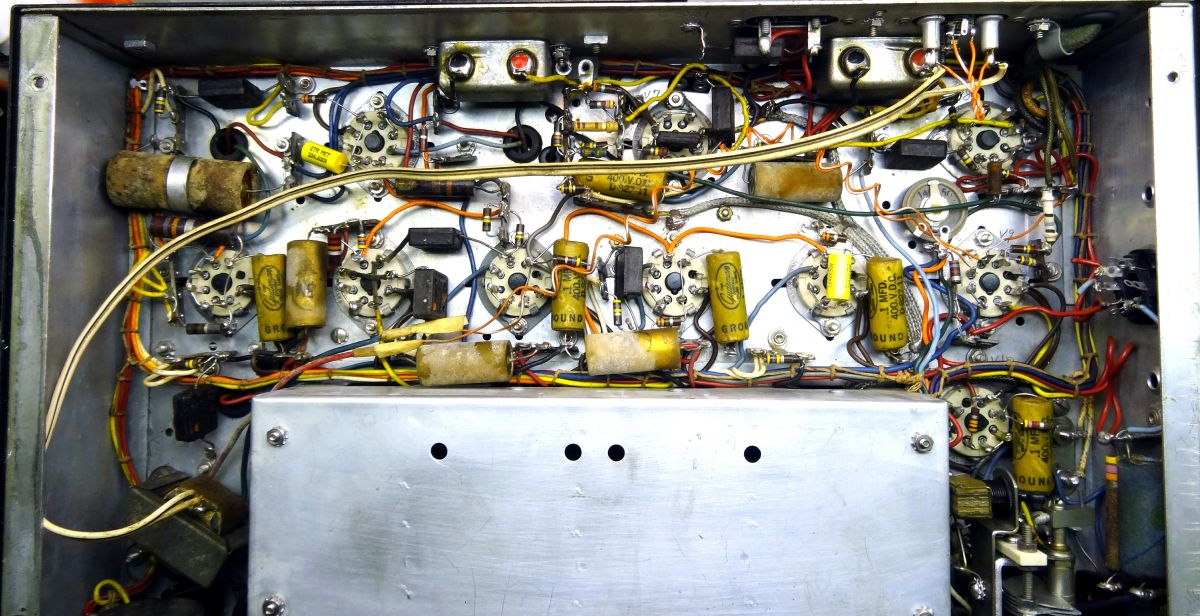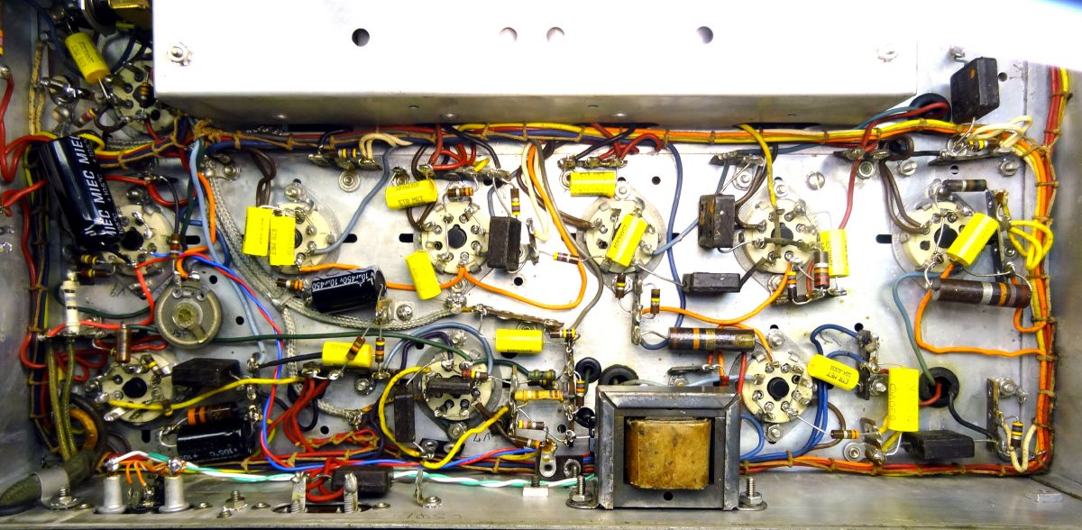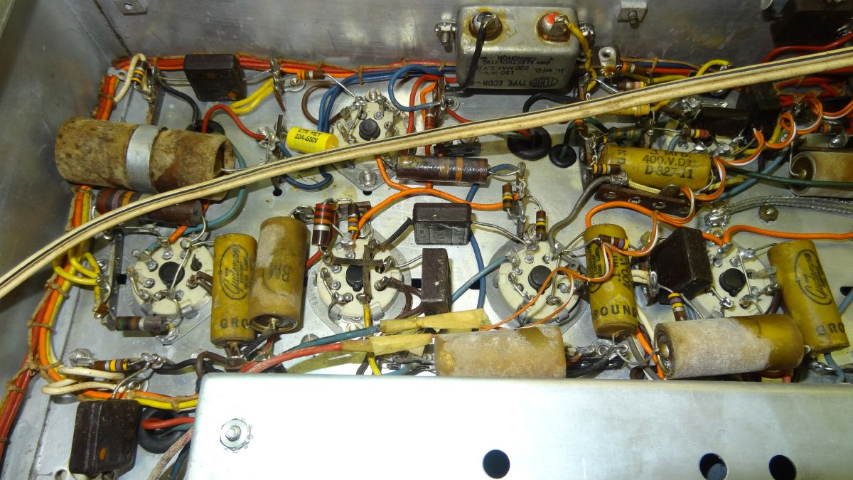 The completed under chassis restoration. Capacitors replaced, Audio output transformer relocated to back panel and rewired. The large black electrolytic at the upper left is an additional 100uf 450v on the B+ line.