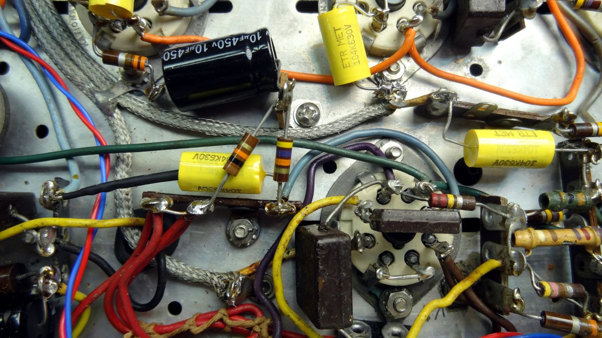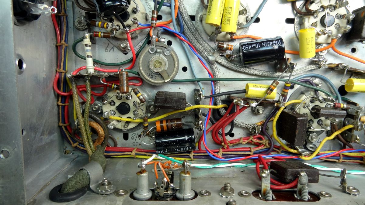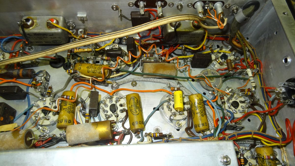This photo shows the wiring to an output transformer that I retained but moved and cleaned up the wiring in my later restoration. Note one cap has been replaced (bright yellow). This shows the difference in size. All tubulars shown are .1 uf