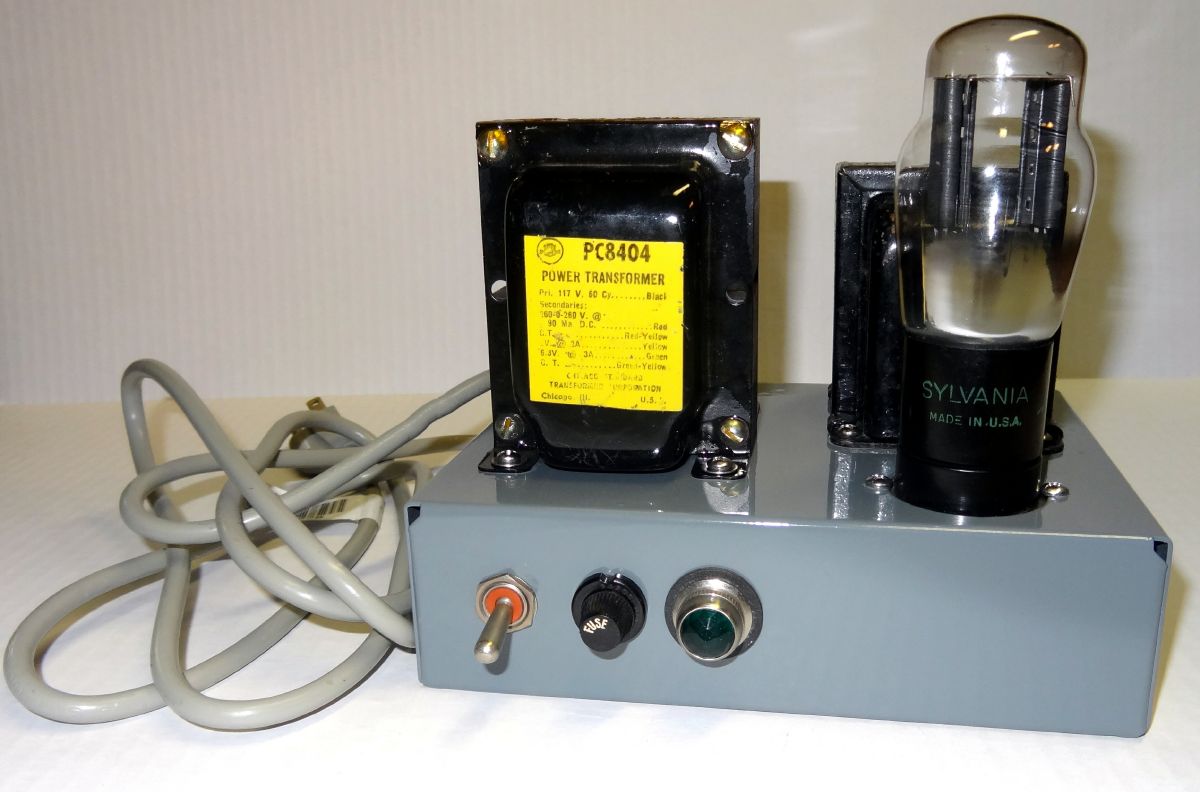 Front view of the new Power Supply. Stancor PC-8404 transformer, 80 rectifier, and 12h 200 ohm choke. Below the chassis is a 100uf 450V electrolytic and a 200K bleeder. It is a standard full wave choke input supply