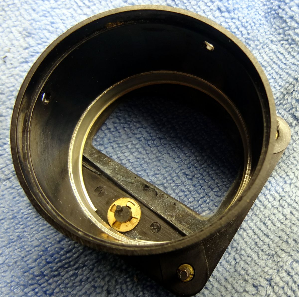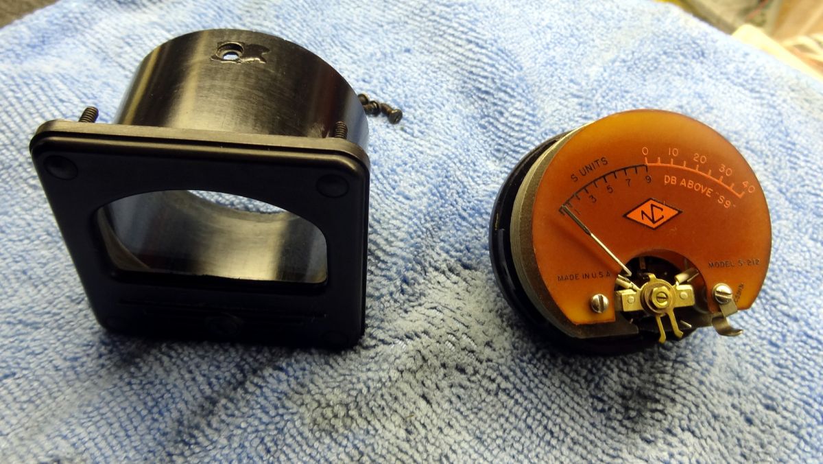 As you can see in this photo there are a couple of places where our rodent friends have caused the chassis plating to rust through. I was going to grind this down and paint over but it obviously has nothing to do with the operation of the receiver.Mechanically the tuning was smooth and the controls even without cleaning were noise free. Quite an achievement for a receiver that is 70+ years old and has been setting in not the best environment for some of that time. A few things topside did need attention. The S meter glass had been pushed in and in turn pushed the meter needle against the front plate making it inoperable. This required removal of the meter from the chassis. Once removed three screws around the rear perimeter were remove allowing the meter to be removed from its housing. There is a retention ring that hold the glass against the front of the meter face. This ring had been pushed back. I carefully tapped it back using a small screw driver against the edge and moving around the perimeter. Be very careful if you have to do this as you do not want to break the glass. After the glass was tight against the front I cleaned everything very well. I then carefully pulled the needle back to position. Before reassembly align the adjustment tab on the meter to its center position and the adjusting screw tab in the housing to bottom center. Carefully reinsert the meter into the housing making sure that the meter needle has free movement once it is installed. Reinstall the screws and meter into the front panel. The original Pilot light was broken so I installed a new assembly. This probably had a 6V lamp in it but I always install 12V replacements for two reason, one I have lots of 12V lamps, and two they provide plenty of light and will have a substantially longer life.