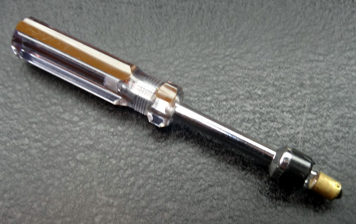 As received the receiver had a glass 6L6 in place of the 6V6 audio output tube. While this worked fine in does draw more filament current and is really unnecessary so I replaced it with a metal 6V6 from my stock. This produced no real difference in audio output or quality. The front panel red pilot light was out. So how to replace it. It is impossible to get to it with your fingers so I fashioned a nut driver with some black electrical tap to snugly grab the bulb. It is a bayonet base so pushing down and turning allowed removal.