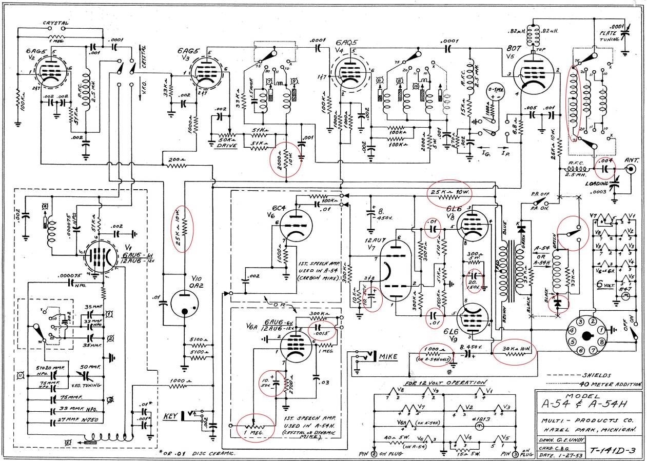 Original A54/A54H schematic with some of the parts that were removed, replaced, or changed circled in red. Kicad schematic coming soon for actual circuit changes.